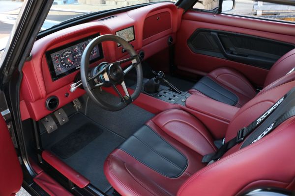 The interior is equally as custom and modernize with a leather-wrapped custom dash fitted with Holley digital instruments. The bulk of the interior work was handled by Sew Cal Rods, including stitching new seats in red and black leather. There’s also air conditioning, a thumping stereo, and a rollcage for added safety.